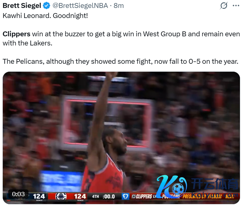 NBA记者Brett Siegel写说念:“科怀-莱昂纳德,晚安!快船队在终末一秒赢球,取得西区B组一场胜胜,战绩与湖东说念主队执平。鹈鹕队尽管进展出一些斗志,但本赛季战绩仍为0胜5负。”