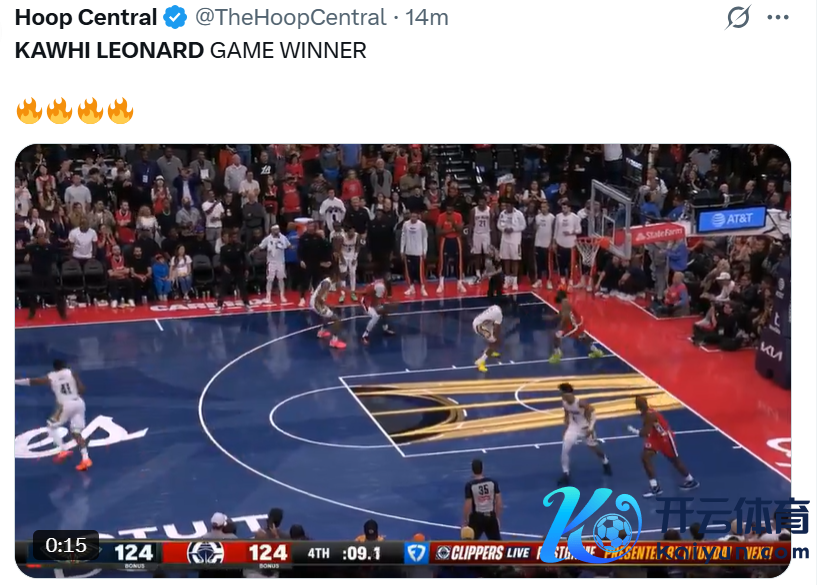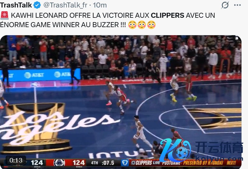“莱昂纳德在比赛终末一秒送出一记惊天压哨两分,助快船队取得告捷”。