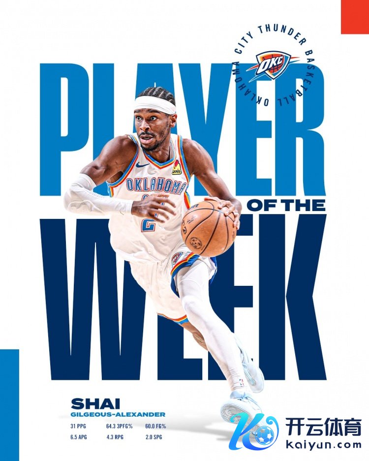 亚历山大上周率队取得了4胜0负的战绩,场均31分4.5篮板6.5助攻2抢断,投篮掷中率60%,三分掷中率64.3%,罚球掷中率90.2%。