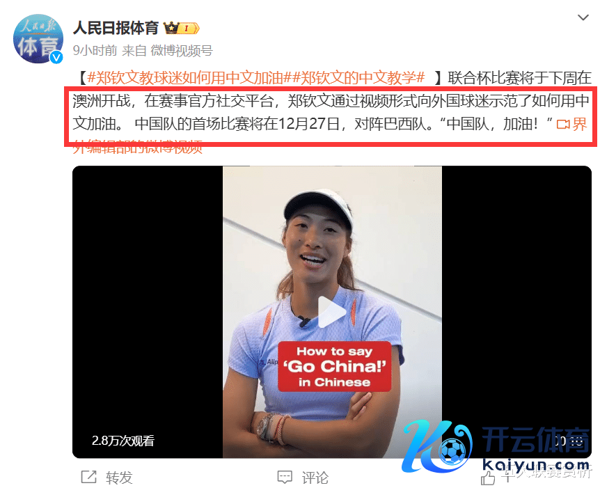 阐述东谈主民日报体育的音讯,相接杯足下方官网 在顶住上头发布了一条郑钦文的视频。郑钦文看成干与相接杯排行第四高的选手,按照大部分东谈主的想维,她可能会匡助足下方宣传一下相接杯赛事,或者预测一下我方的贪图。然则郑钦文的“情商”却特殊的高。她并莫得这样作念,而是用中语教番邦球迷怎样给中国队加油。