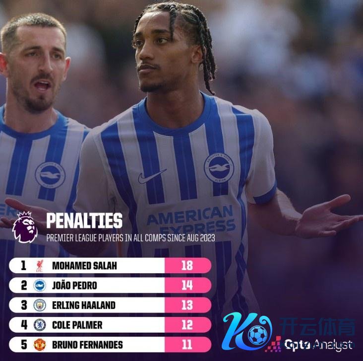直播吧4月12日讯 在本轮英超布莱顿对阵莱斯特城的比赛中,若昂-佩德里打进点球。以下为英超球员自上赛季在各项赛事中点射破门次数榜: