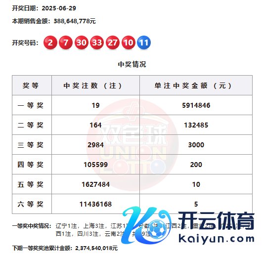 22:10 本期一等奖开出19注,单注奖金591万余元,其中上海、广东、四川各中出3注,江西、重庆、云南各中出2注,辽宁、江苏、安徽、广西各1注!二等奖开出164注,单注奖金13.2万余元。本期双色球宇宙销量为3.88亿余元,计奖规定后奖池余额为23.74亿余元。