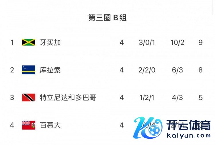 笔据晋级次第体育集锦,第三阶段12支球队分为3组,每组4队进行双轮回赛事,各小组头名径直晋级寰宇杯。11月14日,牙买加对阵特立尼达和多巴哥、库拉索对阵百慕大,牙买加和库拉索11月19日将正面交手。