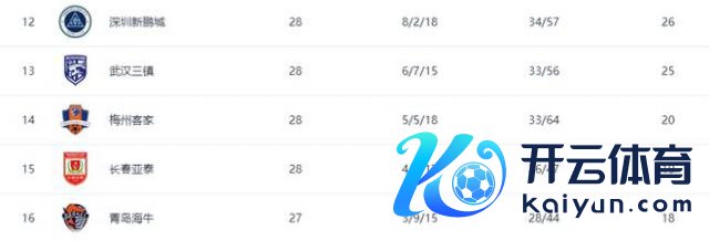 27 轮之后,武汉三镇以 25 分排行第 12 位,深圳新鹏城(23 分)、梅州客家(20 分)分辨排行第 13、第 14 位,青岛海牛、长春亚泰同积 18 分,后者以净胜球舛错垫底。