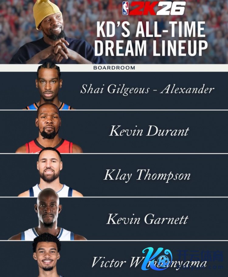 11月25日讯 今天,火箭球星凯文·杜兰特在社媒晒出了我方心目中的2K首发五东谈主组。