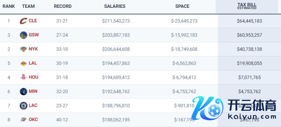 02月06日讯 NBA来去界限日认真杀青,现在仅有8支球队需要交纳奢华税: