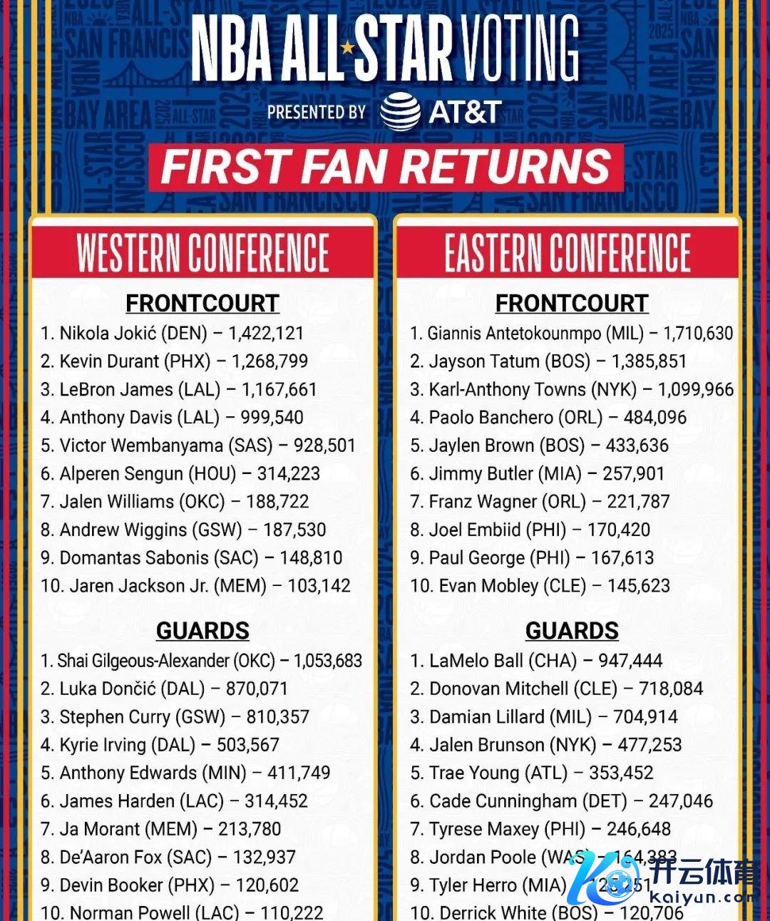 约基奇呢,这位来自西部的巨星,如同巍峨的峻岭,以1,422,121票领跑西部前场。