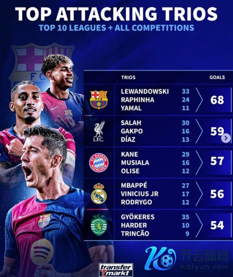2月26日讯 《转会商场》统计了本赛季欧足联名次前十联赛的球队三叉戟各项赛事总进球情况,巴萨三东谈主组以68球领跑。