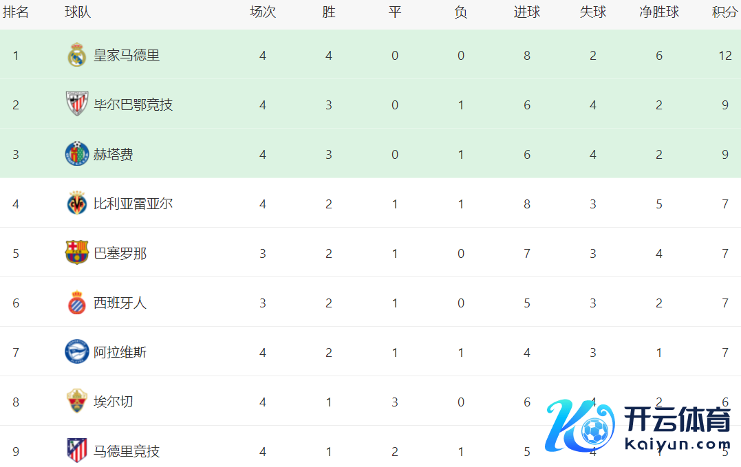 在积分榜上,皇马以12分排行榜首。皇马是西甲惟一全胜的球队,4场联赛齐赢了,无疑是夺冠最大热点。毕尔巴鄂竞技拿到9分,排行第2。赫塔费亦然9个积分,排行第3。第4的是比利亚雷亚尔,拿到7分。巴萨亦然7分,排行第5。不外,巴萨只踢了3轮比赛。马竞1胜2平1负,只拿到5分,排行第9。