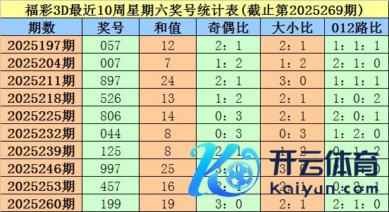 福彩3D第2025260期(上周星期六)奖号为199。其中奖号奇偶比为3:0,大小比为2:1,012路比为2:1:0。